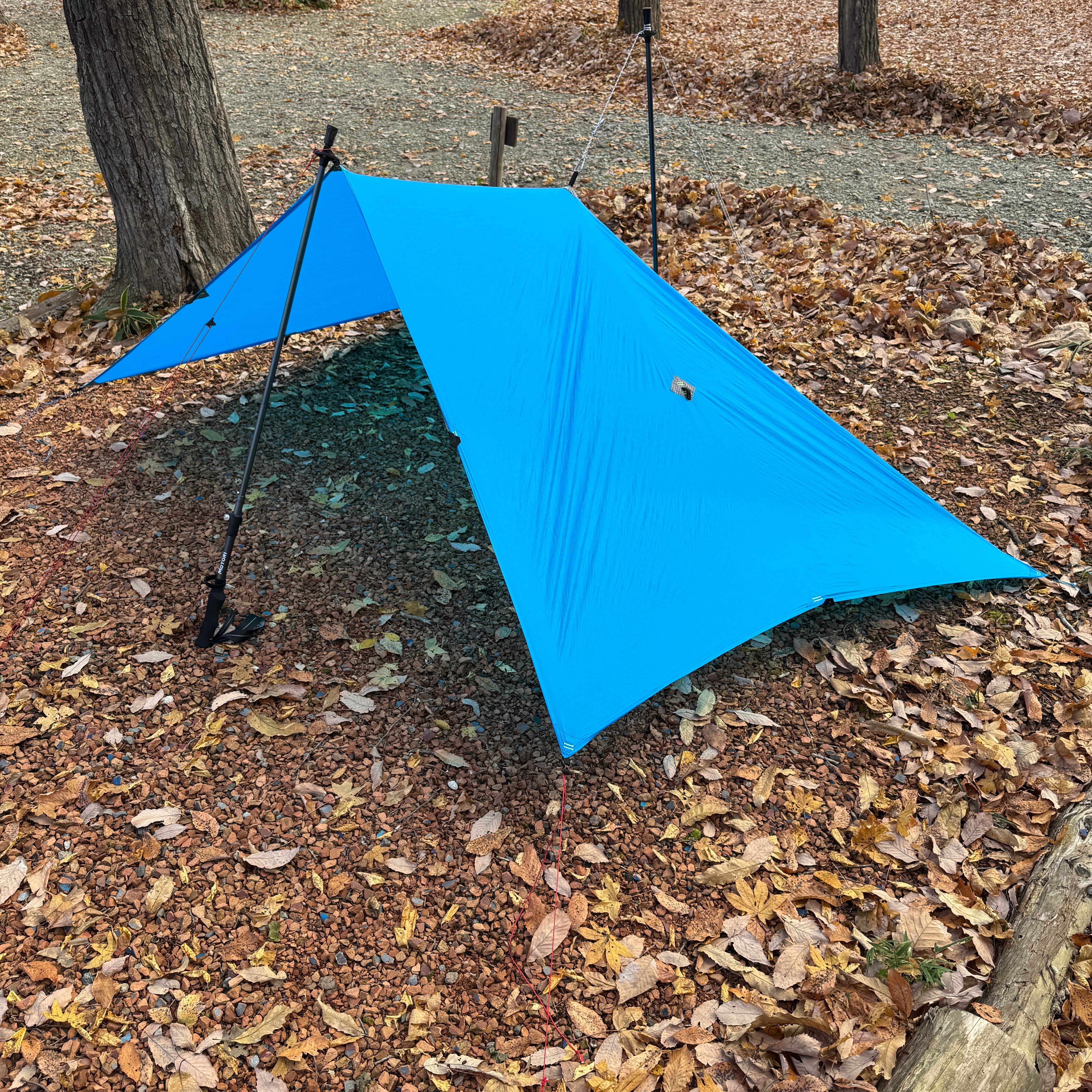 トレッキングポールやソロ用のポールとガイロープがあればすぐにでもULなタープ泊をする事ができます。